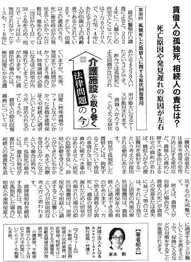 | 連載「介護施設を取り巻く法律問題の今」『第168回 孤独死した賃借人に関する原状回復費用』を、執行役員・弁護士 家永 勲が執筆しました。 | |