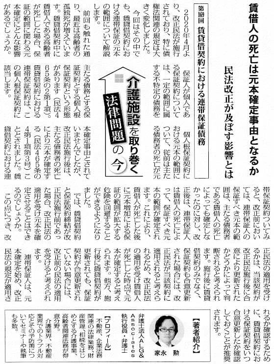 | 連載「介護施設を取り巻く法律問題の今」『第169回 賃貸借契約における連帯保証債務』を、執行役員・弁護士 家永 勲が執筆しました。 | |