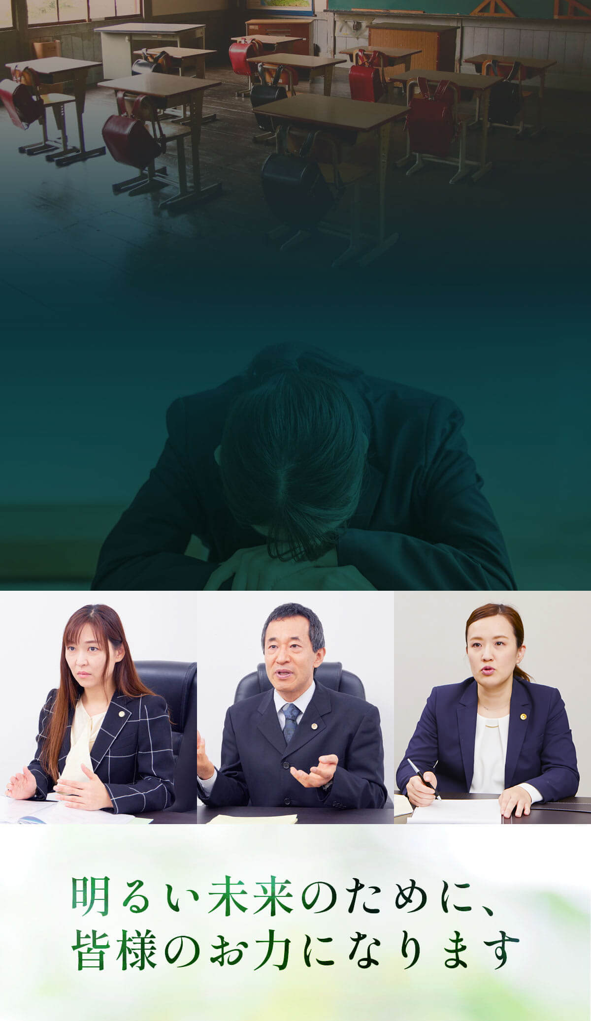お子様が1日でも早く平穏な生活に戻り、安心して登校できる環境を取り戻すため尽力いたします。いじめ被害でお悩みの場合はぜひ私たちにご相談ください。