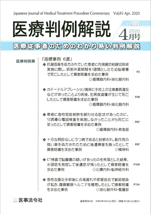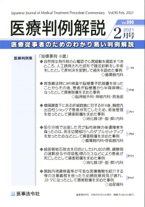 - 「抗凝固薬を処方されていた患者に内視鏡的粘膜切除術実施に際し、術前休薬期間を1週間としたため脳梗塞で死亡したとして損害賠償を求めた事例」(医療判例解説・令和2年4月号、医事法令社)