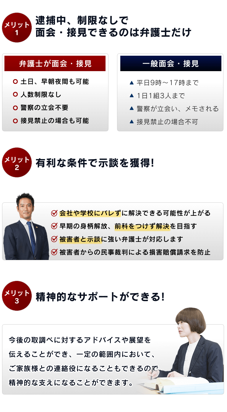 この接見・面会が守られることで、拘束されて社会との接点が遮断されている逮捕者が弁護士を通じて社会との接点を持ち、精神的な安定を得られ、毎日に渡る取り調べによる疲労や重圧を回避し、弁護士が違法な取り調べがないかチェックすることで、逮捕者が不利な証言をしないように弁護士との話し合うことで不起訴に向けた弁護活動が可能になります。