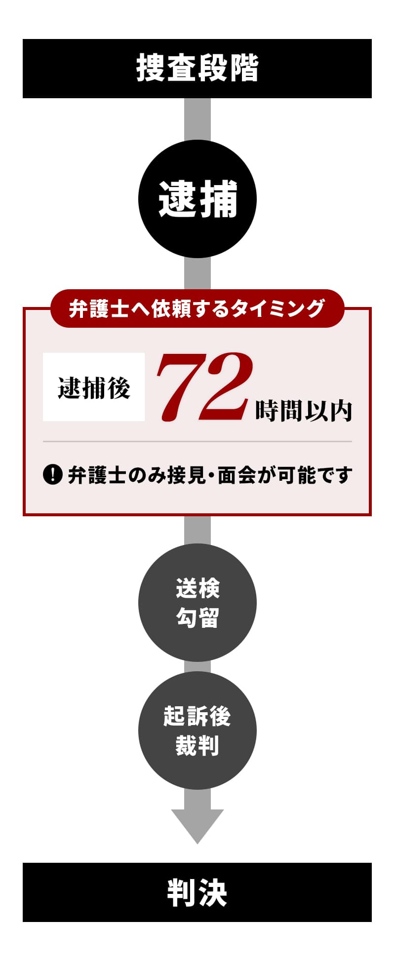 弁護士が入ることにより、逮捕後72時間で勾留されず身柄が解放されたという事案も多数あります。ご依頼後、迅速な対応をお約束します。