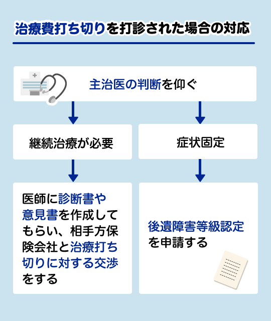 このような治療打ち切りの連絡を受けたら、「治療費の延長交渉を行う」、「治療費打ち切り後も自己負担で治療を続ける」など適切に対処する必要があります。