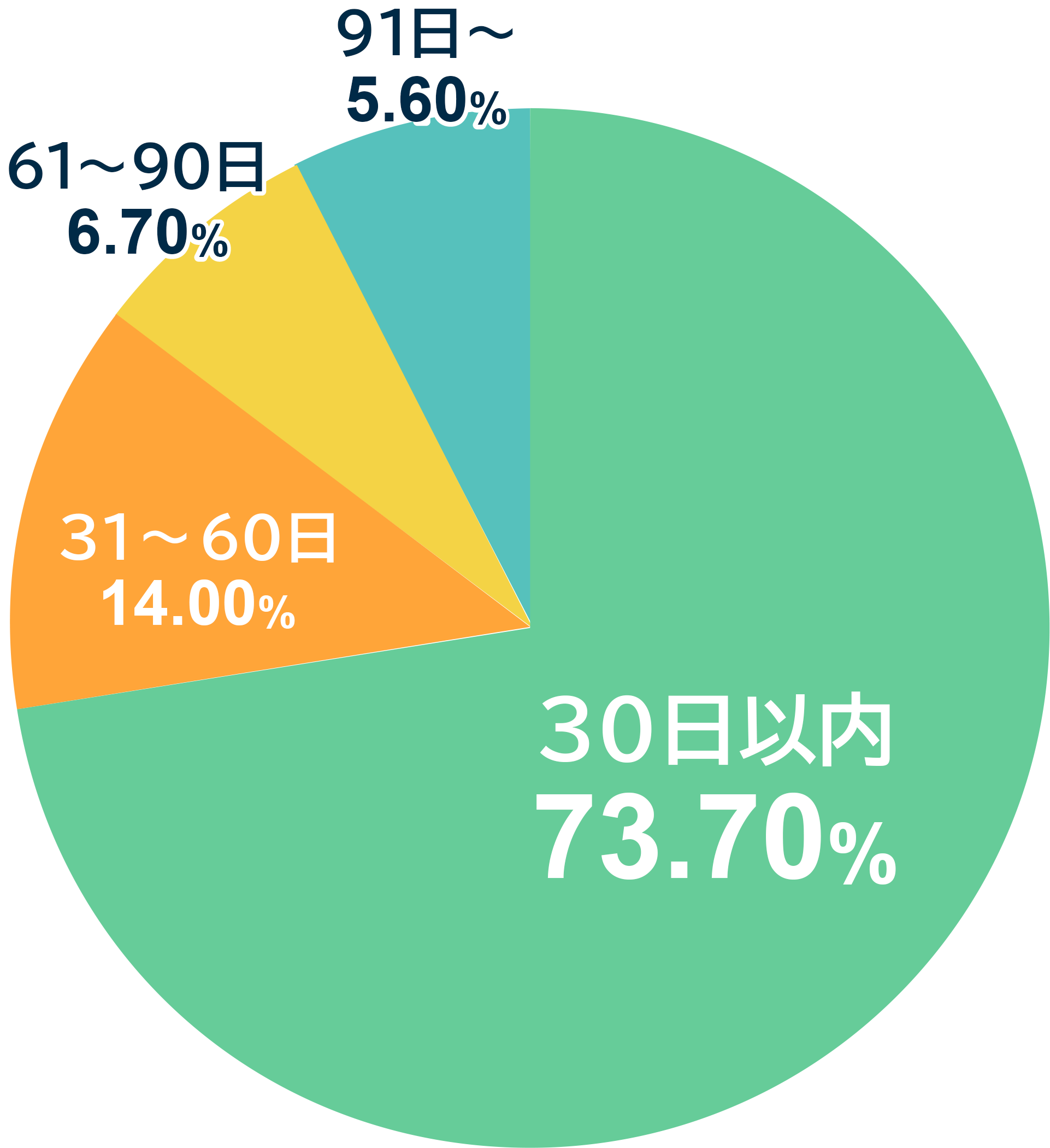 2023年度版損害保険料率算出機構の上記データをみると、後遺障害等級認定の審査にかかる期間は、最も多いのが30日以内で73.7%、次に多いのが31日~60日で14%となっています。
