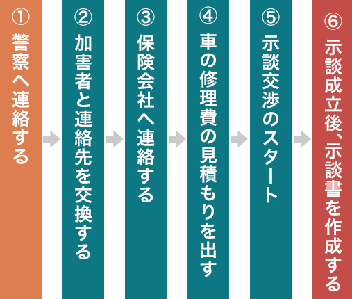 車の修理費や買替え代金の見積額、代車費用など、すべての損害額が出ると、加害者側の保険会社から示談案が届き、示談交渉がスタートするのが通常です。(加害者が保険に未加入ならば、加害者本人と交渉します。)