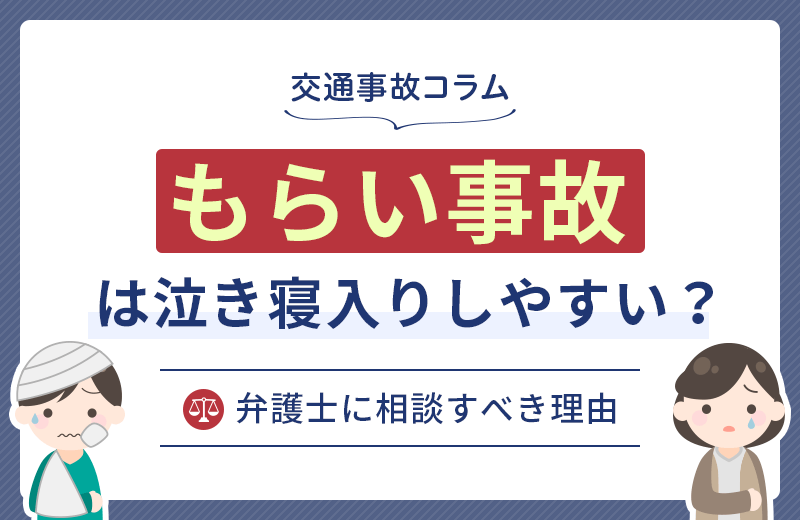 もらい事故では被害者の方が泣き寝入りしてしまうこともあります。 もらい事故の場合は自分で示談交渉をしなければなりません。加害者には過失があるため、示談交渉は被害者と相手方保険会社と行うことが一般的です。 相手方保険会社は示談交渉のプロであるため、損害賠償金に納得がいかない場合でも、巧みな話術に引き込まれ、言いくるめられてしまう可能性があります。 ここで注意が必要なのは、相手方保険会社が適切な金額を言っているとは限らないということです。相手方保険会社も営利団体のため、会社の損害は最小限に抑えたいと考えるからです。 また、相手方保険会社は交通事故の知識量も被害者の方とでは差が大きくなっています。専門用語を使うことで被害者の方に「こうやって言っているし、そうなのかな?」と思わせてしまいます。 もらい事故の示談交渉では、弁護士に相談することをおすすめします。