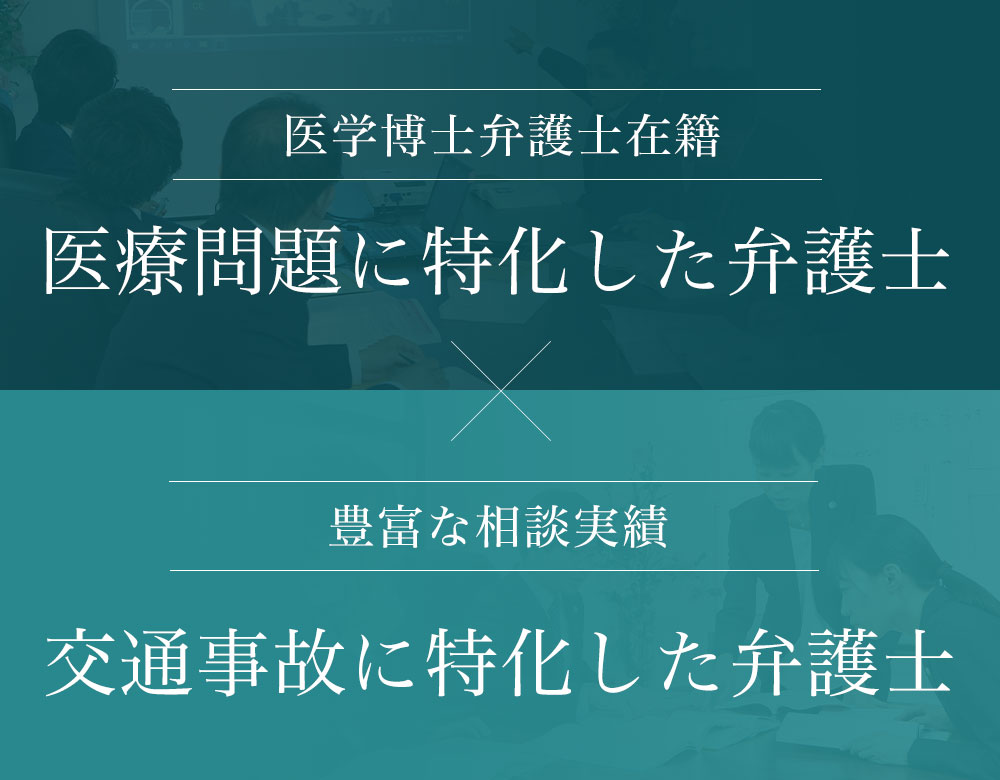 医学的知見をもつ医療問題に特化した弁護士と豊富なお問合せ実績をもつ交通事故に特化した弁護士が連携し 適正な後遺障害等級の認定・損害賠償の獲得を目指し尽力いたします