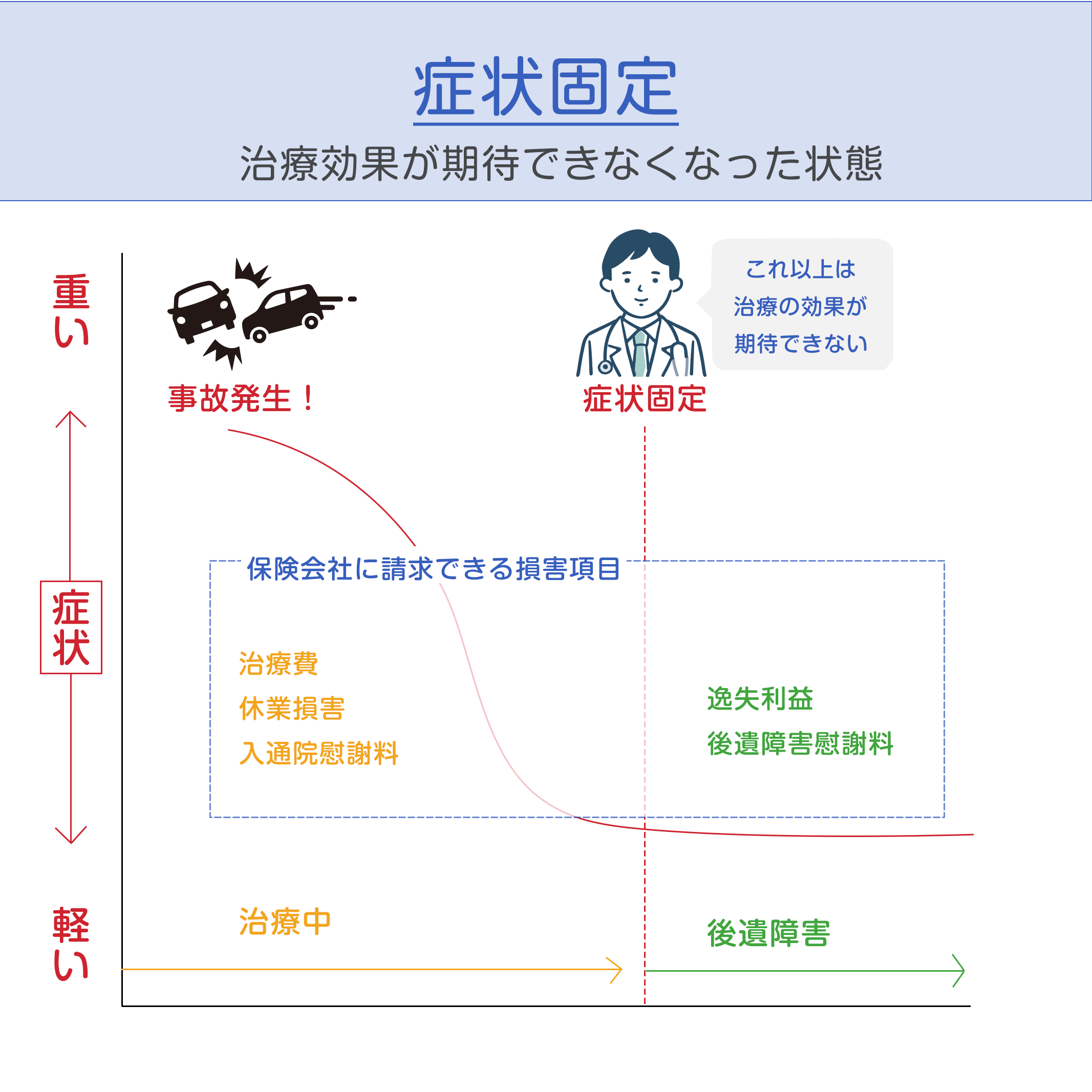 この言葉をあまり日常で耳にすることはないですが、症状固定の前後で請求できる損害賠償項目や金額が異なるため、症状固定の時期はとても大切です。