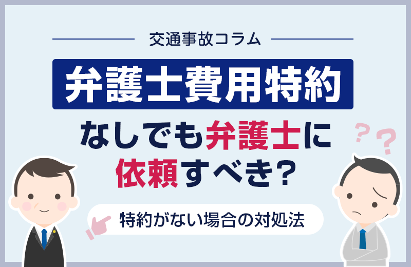 交通事故に遭ったことにより弁護士に依頼すると、着手金や成功報酬などの費用がかかります。 中にはお金がかかることが不安で弁護士に相談することをあきらめてしまったり、そもそも交通事故が弁護士に依頼できることすらご存知なかったりする方もいらっしゃるかもしれません。 しかし、そのような心配はご無用です。もし、加入している保険に弁護士費用特約が付帯していれば、弁護士費用を大幅に抑えることができます。 では、弁護士費用特約が付いていない方は弁護士に依頼できないのでしょうか。 答えは、特約がなくても弁護士に依頼することが可能です。費用面で心配な方は弁護士に相談することもできます。 この記事では弁護士費用特約がない方に向け、弁護士費用特約とは何なのか、特約がなくても弁護士に相談するべきなのか、解説していきます。