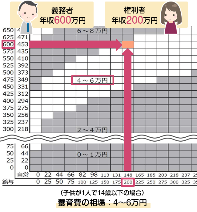 養育費を支払う側が年収600万円の場合の養育費の相場について養育費算定表を参考に確認しましょう。 養育費の相場は、父母の年収、給与所得者か自営業者か、子供の人数・年齢によって異なります。