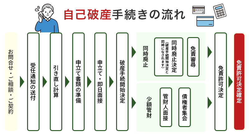 自己破産を弁護士に依頼した場合、次のような流れで手続が行われます。